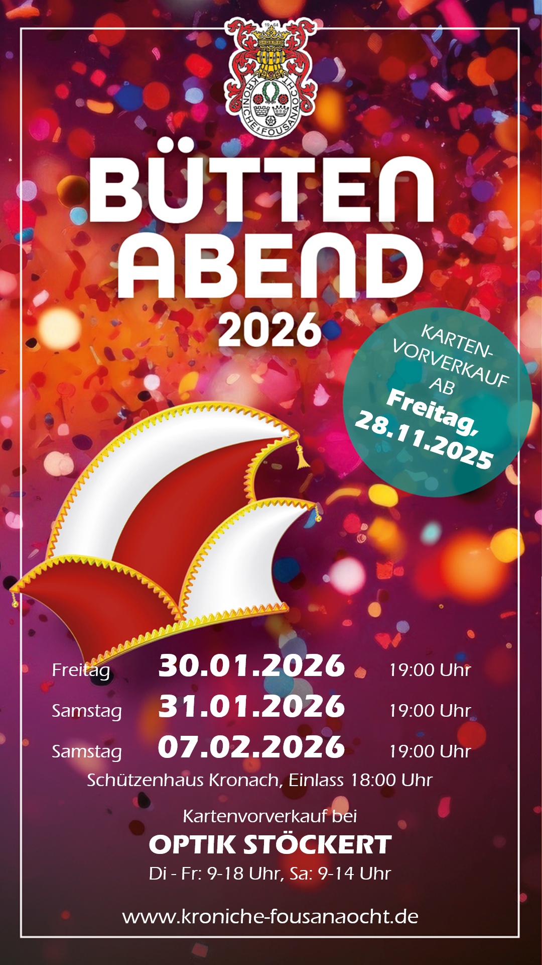 Liebe Närrinnen und Narren, liebe Gäste aus Nah und Fern, mit einem Kronich Feuedunnekeil begrüßen wir Euch auf unserer Internetseite. Hier findet Ihr Informationen zu aktuellen Ergeinissen, zur Geschichte und zu den bevorstehenden Terminen der Kroniche Fousanaocht. Wir sind fulminant in die neue Session 2025/2026 gestartet. Bei unserer Prinzenpaarvorstellung am 14.11.2025 wurde endlich das bestgehütete Geheimnis Kronachs gelüftet, und wir haben mit Stolz unser neues Prinzenpaar Jens II. und Julia II. präsentiert. Außerdem wurde der neue Sessionsorden vorgestellt, den wir den Rosenberglern zum 75-jährigen Bestehen gewidmet haben. Wir durften begeisternde Auftritte der Jugend-, Junioren- und Prinzengarde des ATSV Kronach erleben sowie die Auszeichnung unseres Elferrats Steffen Mahr mit dem Verdienstorden durch den Fastnachtverband Franken. Und natürlich laufen auch die Planung zu unseren 3 Büttenabenden am 30., 31. Januar, und 07. Februar 2026 sowie für unseren Kinderbüttenabend am 13. Februar 2025 bereits auf Hochtouren, damit wir unser Publikum wieder mit einem Feuerwerk der guten Laune bestens unterhalten können. Der Kartenvorverkauf für die Büttenabende startet am 28.11.2025 bei Optik Stöckert. Für den Kinderbüttenabend findet der Kartenvorverkauf am Samstang, den 31.02.2026 ab 15:00 Uhr statt. Alle Termine gibt es hier noch mal im Überblick. Eure Kroniche Fousanaocht |